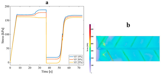 (a) Stress recovery cycle for the anisotropic tree-like structure for three VFs: 15%, 20%, and 25% under 3% tensile pre-strain and (b) stress distribution for a 15% VF asymmetric structure in the loading state.