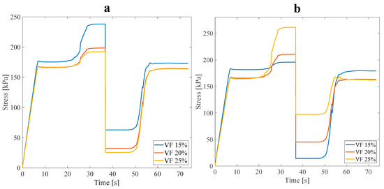 Each anisotropic model was numerically designed for three VF values of 15%, 20%, and 25%. All three main anisotropic models were analyzed following approach B’s conditions to investigate the impact of VF on the mechanical and thermophysical properties of the structure. All models were subjected to a 3% tensile pre-strain, and the stress recovery test had already been performed. Figure 7 demonstrates the tree-like structure’s thermomechanical response, where VF is a curve parameter corresponding to approach A (see Figure 2b). Furthermore, Figure 8 illustrates the stress recovery cycle of symmetric and asymmetric structures and their thermomechanical response, loaded with three mentioned VFs under the conditions of approach A.