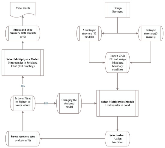 In the following, based on the flowchart represented in Figure 10, the selected anisotropic structure corresponding to approach B is discussed. As the flowchart explains, three-dimensional SMP structures were created in SolidWorks for the following two types: anisotropic and isotropic. Anisotropic structures with various VFs and different angles between the main branch and the sub-branches were developed to study the effect of design parameters on SMP’s thermal and mechanical properties. The previously generated computer-aided design (CAD) file was imported into the commercial finite element software, and then material properties and boundary conditions were prescribed. The loading, cooling, fixing, and heating processes were applied to SMPs, and the stress recovery curves were obtained. By calculating the parameter and choosing its maximum and minimum values, the mathematical optimization process was performed for all 16 structures. The final optimal structure was selected and then numerically investigated regarding approach B. Finally, stress recovery and shape recovery diagrams were plotted by applying appropriate boundary conditions and inlet fluid pressure. Then, the impact of the presence of fluid flow on the heat transfer process in an SMP structure was analyzed.