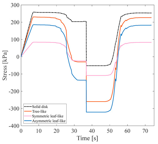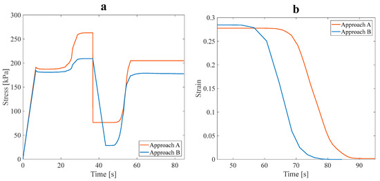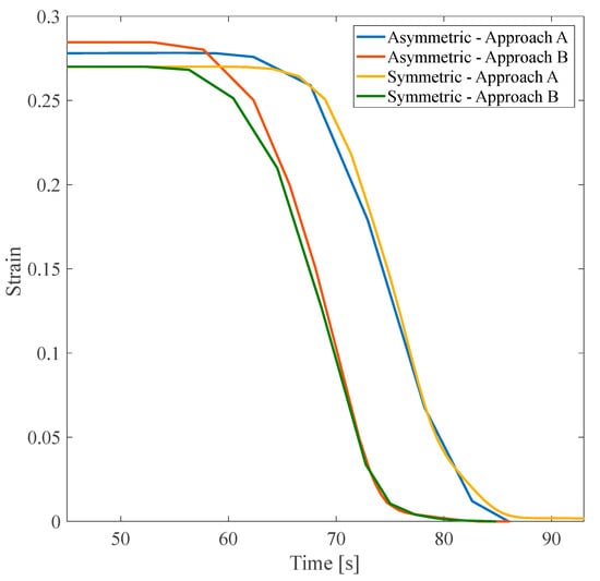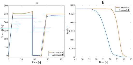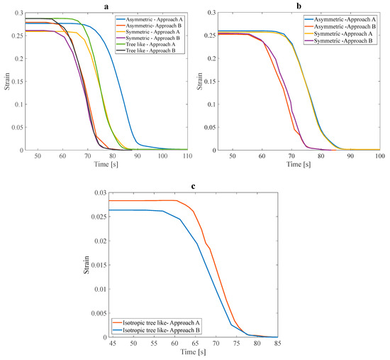 In this subsection, a symmetric isotropic structure corresponding to the maximum and minimum values of was determined and numerically studied afterward, considering approach B. The stress recovery cycle in approach B under a 3% tensile pre-strain for the symmetric isotropic model is shown in Figure 14.