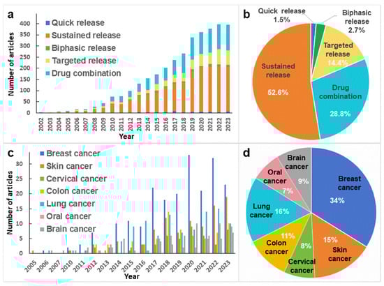 Electrospinning can be used to incorporate drugs into nanofibers, resulting in a decelerated drug release rate, extended release duration, minimized drug dispersal, and effective mitigation of potential adverse effects from multiple-drug delivery [3]. Moreover, electrospun drug-loaded nanofibers have the capacity to concurrently accommodate various drugs, fostering a synergistic effect among them. This synergy revitalizes initially drug-resistant compounds, generating novel therapeutic effects [4,5]. Figure 1 depicts the upward trajectory of articles published in the past 20 years on the “Web of Science” database, focusing on “electrospinning & drug delivery” and “electrospinning & cancer”, respectively. As shown in Figure 1a,b, the data reveal that the applications of electrospinning in drug delivery continues to increase, with the primary research areas including sustained release, drug combination, and targeted release. The data in Figure 1c,d demonstrate the growing application of electrospinning in cancer treatment research. Most of the studies are about lung cancer and breast cancer, and research on other types of cancer is also increasing year by year.
