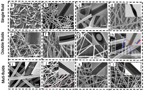 SEM and TEM images of electrospun drug-loaded nanofibers with various structures. Single-fluid electrospinning: (a) Bead-on-string fibers [7]. Copyright 2018, reproduced with permission from Nature. (b) Smooth fibers [8]. Copyright 2022, reproduced with permission from MDPI. (c,d) Core–sheath fibers [10,11]. Copyright 2023, 2019, reproduced with permission from Elsevier. Double-fluid electrospinning: (e) Smooth fibers [9]. Copyright 2021, reproduced with permission from MDPI. (f) Core–sheath fibers [12]. Copyright 2020, reproduced with permission from Elsrvier. (g) Beaded core–sheath fibers [13]. Copyright 2019, reproduced with permission from WILEY. (h) Janus fibers [17]. Copyright 2021, reproduced with permission from Elsevier. Multi-fluid electrospinning: (i) Two-layer core–sheath fibers [14]. Copyright 2016, reproduced with permission from Elsevier. (j) Three-layer core–sheath fibers [15]. Copyright 2020, reproduced with permission from MDPI. (k) Four-layer core–sheath fibers [16]. Copyright 2021, reproduced with permission from Elsevier. (l) Two core fibers and one sheath fiber [18]. Copyright 2020, reproduced with permission from Elsevier.