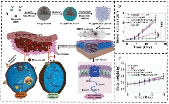 Application of gelatin/polycaprolactone (GP) nanofiber scaffolds in inhibiting proliferation of skin cancer cells [134]. Copyright 2021, reproduced with permission from WILEY. (a) The synthesis process of the ACC@Fe2+/BLM-CaSi-GP stent and its complementary ability to simultaneously treat melanoma and wound healing. (b) Weight change (n = 5) and (c) survival curves of nude mice bearing tumors under different treatments with MCF-7/ADR at 21 days.