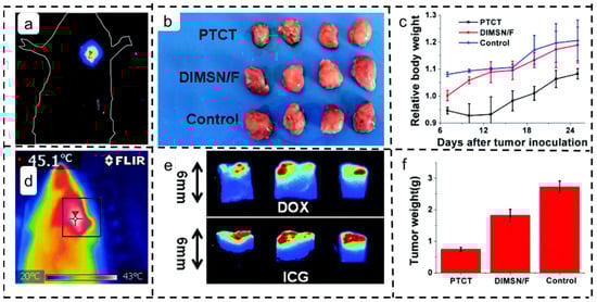 Application of chitosan/poly(vinyl alcohol) (CS/PVA) drug-loaded nanofiber scaffolds in the treatment of cervical cancer [140]. Copyright 2019, reproduced with permission from RSC. (a) Fluorescent (ICG) images of DIMSN/Fs subcutaneously implanted in the left axilla of mice. (b) Macroscopic tumor observation. (c) Relative tumor volume in each group. (d) Infrared thermal images of DIMSN/F mice after 808 nm laser irradiation. (e) Tumor weight. (f) Fluorescent images of tumor transects removed from the three mice receiving the first PTCT scan.