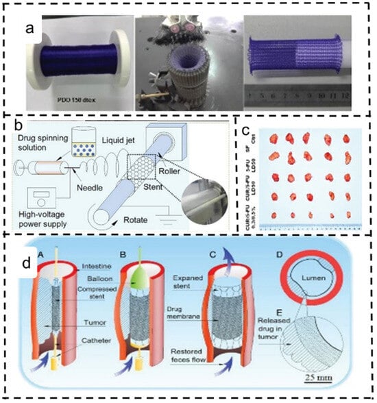 Application of expanded electrospun nanofiber scaffolds for colon cancer treatment [141]. Copyright 2018, reproduced with permission from WILEY. (a) Tubular stent diagram. (b) Schematic representation of a modified electrospinning machine. (c) Macroscopic images of exposed tumors. (d) Mechanism and process of drug-loaded stent placement and its role in colorectal cancer treatment. A, deflated balloon catheter and compressed drug-loaded stent are inserted into the stenosis site; B, inflated balloon expands the stent and compresses the tumor to restore the intestinal lumen; C, stent-widened intestine; D and E, the drugs are released from the coating membrane and the tumor is treated locally and effectively.