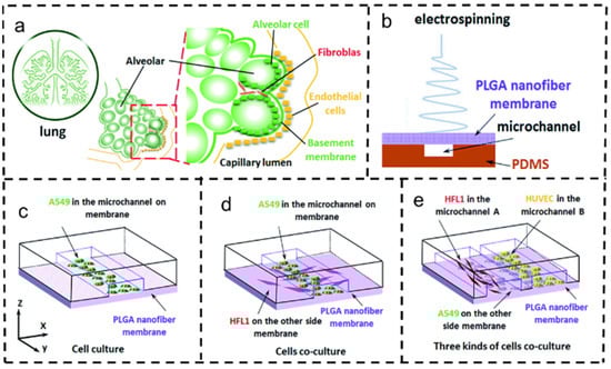 Application of electrospun fibers in exploring lung cancer mechanisms and simulating the tumor microenvironment [146]. Copyright 2018, reproduced with permission from RSC. (a) Schematic of alveolar structure. (b) Schematic of a microfluidic chip with PLGA nanofiber film as a substrate prepared by the electrospinning method. (c) Schematic representation of A549 cell culture on a chip. (d) A549 cells co-cultured with HFL1 cells. (e) A549 cells co-cultured with HFL1 cells and HUVECs.