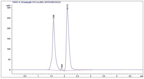 All measurements of the rivastigmine and insulin were completed using HPLC (Agilent, Waldbronn, Germany). A filtered and degassed mixture of sodium phosphate buffer solution and acetonitrile was used as the mobile phase. The equipment consisted of a UV–Vis detector and reversed-phase column C18, 4 µm. The mobile phase was delivered at a flow rate of 0.75 mL min−1, the injection volume was 2 µL, the effluent was monitored at UV detection at 215 nm, and the retention times for insulin and rivastigmine were 1.588 and 2.113 min, respectively (Figure 1).