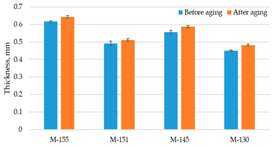 The values for the thickness of unexposed materials range from 0.45 to 0.62 mm, while those of exposed materials are 0.48–0.64 mm (Table 3). As can be seen from the comparison in Figure 1, the thicknesses of all tested materials increased slightly after aging. These results are reliable due to the very small variation between the repeated values, which was confirmed by the coefficient of variation (0.68–2.79%), as well as the low values of standard deviation (presented in Figure 1). The observed decreases in thickness can be explained by the increased shrinkage of the material as well as by the increased number of particles within the material structure, which was previously discussed based on the microscopic images. It should also be noted that the greatest increase in thickness was observed in the material produced from recycled polyester (M-130), suggesting that the loop structure of the recycled material is less stable when exposed to aging factors, i.e., it has a greater tendency to deform. This behavior is expected to affect various physical-mechanical properties of a material, which will be discussed in the next sections.
