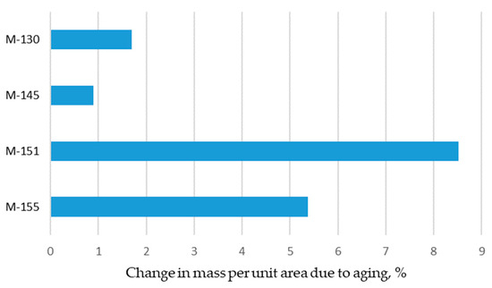The results, which show the change in mass per unit area due to aging, are shown in Figure 2. The change in mass per unit area shown is compared to the mass per unit area values of the materials before aging. As can be seen from Figure 2, the mass per unit area increases after aging for all materials observed. The increase is up to 8.5% (the highest for the material labelled M-151). As can be seen, the increase in mass per unit area is higher for materials with lower declared masses, both for conventional and recycled materials. The previously discussed results also suggest that the aging process affects the shrinkage of the materials, as can be seen in the material property discussed previously.