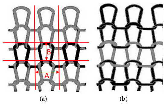 In order to further explain the observations related to the outcomes of the material thickness and mass per unit area measurements, additional measurements of the horizontal (Dh) and vertical (Dv) densities were conducted. Figure 3 shows the structure model of knitted fabric including the fabric face (a) and back side (b). The Dh and Dv were determined by counting the numbers of segments A (wale spacing) and B (course spacing).