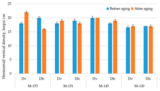 The results show that the densities of the observed materials in the horizontal direction are different for tested materials and do not indicate the unequivocal behavior of an observed set of polyester materials in this direction. Opposed to that, there is an overall increase in the vertical density of materials that confirms the shrinkage of material in the vertical direction and is in line with the discussion related to the values of material thickness and mass per unit area. For these material properties, the mass of the material has a higher influence on the results after aging than the type of yarn (i.e., conventional vs. recycled).