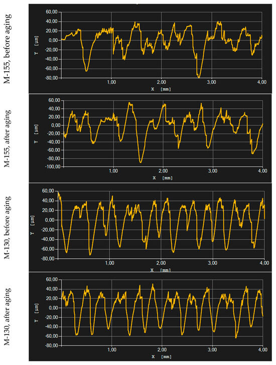 Figure 5 shows the graphs generated by the surface roughness measuring device. These graphs illustrate the height changes on the surface of the material versus distance. Specifically, the graphs show individual measurements in the horizontal direction for two different materials, M-155 and M-130, before and after the aging process. The vertical axis (Y) shows height changes on the surface of the material, while the horizontal axis (X) shows the measurement length or distance on the surface of the material. An analysis of the graphs reveals that differences between peaks and valleys on the material’s surface are evident for both samples, before and after the aging process. This indicates the presence of considerable irregularity or high surface roughness. After the aging process, material M-155 showed even greater height differences, resulting in increased roughness. This increase in surface roughness after the aging process suggests that this process had a detrimental impact on the surface quality of M-155, making it rougher and more uneven. Regarding material M-130, after the aging process, it showed slightly lower height differences. The reduced height differences could suggest that the aging process had a smoothing effect on M-130, leading to a decrease in surface roughness.