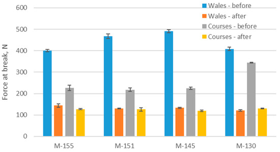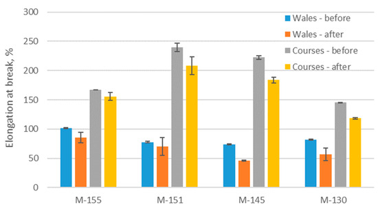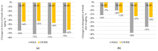 Figure 6 and Figure 7 show the results of force at break and elongation at break of the materials in the wale and course direction before and after the aging process. Figure 8 shows changes in force at break and elongation at break due to aging. The forces at break of the materials were usually higher in the wale direction due to a greater number of loops per unit length, which contribute to greater strength in that direction [49]. The standard deviations for force at break in the wale and course directions were very low, Figure 6. In analyzing the results of the force at break in the wale direction before aging, it can be seen that the values were between 400 and 490 N. After aging, these values were significantly reduced and were between 121 and 143 N, indicating a significant reduction in material strength in the wale direction after aging. There are statistically significant differences between forces at break in the wale direction (p-value is 0.0005). Sample M-145 showed the highest force at break in the wale direction before aging (490.79 N), but this value drastically decreased by 73% after aging, which can be seen in Figure 8a. On the other hand, sample M-155 had the lowest force at break in the wale direction before aging, and after aging, it recorded a decrease of 64%. In an earlier study [41], a decrease of up to 15% was found for fabrics composed of recycled polyester with shorter aging (corresponding to 24 sessions of active training and appropriate care). As shown in the results for the recycled polyester material (M-130), the longer aging time (40 sessions of active training) caused a striking decrease in the force at break, for 70%.