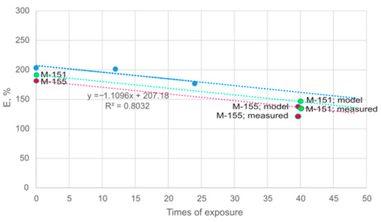 The average values of elongation measured in this paper were compared with the model developed by a group of researchers in a previously published paper [39]. The model was created for the aging of a 100% polyester knitted material with a mass per unit area of 153 g/m2. It was developed for the elongation of the material after 12 and 24 simulated outdoor training sessions and had an R2 = 0.8032 (the results are presented in Figure 9 in blue). Materials M-155 and M-151, evaluated within this research, were used for comparison with the model, as both were also composed of 100% polyester and had similar masses per unit area, i.e., 155 and 151 g/m2, respectively (the results are presented in Figure 9 in red and green). The aging of materials M-155 and M-151 was converted to the number of times of exposure, which in this case was 40. As can be seen from Figure 9, the elongation of materials M-155 and M-151 were slightly lower than those predicted by the model, but both corresponded very well to the proposed model.