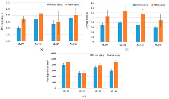 According to the results obtained for the wetting surface (shown in Figure 11c), an increase in the wetting surface was observed for all materials after aging.