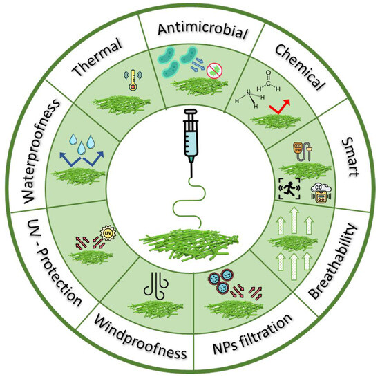 In parallel, protective textiles represent specialized fabrics designed to protect individuals from various external hazards or risks. These textiles are engineered to offer a range of protective functions, varying from resistance to heat, flames, chemicals, microorganisms, UV light, and hazardous particles to protection against wind and water [4,5], as shown in Figure 1. The development of protective textiles continues to evolve, incorporating technological advancements to enhance safety and comfort across various professional and recreational contexts.