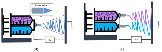 While in uniaxial electrospinning, the polymer, including the compound of interest (purple color in Figure 3c) and the carrier material (blue color), is mixed previously and ejected using a single needle, coaxial electrospinning is based on the simultaneous co-spinning of the two polymeric liquids from two different needles (Figure 3d) [21]. Therefore, the spinneret forms a composite polymeric droplet: the inner liquid (core) is pumped through the internal needle, and the carrier material (shell) through the external needle [22]. In addition, emulsion electrospinning is based on a core–shell structure formation by electrospinning a stable emulsion of two or more phases (Figure 3b). Finally, the multi-nozzle electrospinning assembly has the advantage of better productivity (Figure 3e) [19,20]. The most used electrospinning configurations, namely the conventional, the emulsion, the uniaxial, the coaxial, and the multi-nozzle electrospinning set ups, are depicted in Figure 3.