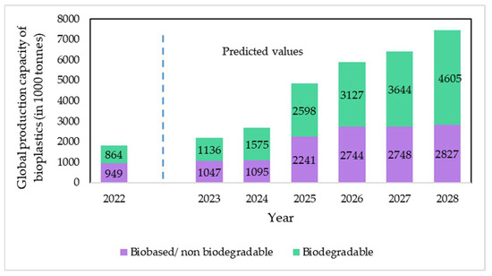Evolution of global production capacities of bio-based polymers from 2022 to 2028 (in 1000 tons) [31].