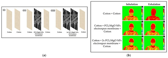 PU is a widely used matrix for the development of breathable fabrics through electrospinning; however, other green matrices have been also studied recently. Starting with Costa et al. (2021), they prepared biodegradable facemasks by functionalizing electrospun PCL fibers with MgO NPs and incorporating them in the middle of two cotton layers. This incorporation led to a decreased air permeability compared to the plain cotton facemask, as the weight and the thickness were increased and the porosity was decreased [52]. In addition, bicomponent membranes were produced by adding AlCl3 into two enantiomers of PLA, namely PDLA and PLLA, through side-by-side electrospinning in the work of Gao et al. (2021). The addition of salt resulted in both a reduction in the fiber diameter and pore size and an increase in the specific surface area, contributing to the membranes’ superior air permeability equal to 10.90 cm3/s/cm2 [86]. Finally, Fadil et al. (2022) conducted a very interesting preliminary study where PVA electrospun nanofibers were inserted as a filter between the layers of a facemask and provided superior properties over melt-blown fibers, such as a small pore diameter and fiber size, interspaces, and an improved air permeability equal to 28.55 cm3/s/cm2. Therefore, the application of active electrospun filters as a potential core component in facemasks can provide better protection from airborne threats [87].