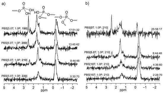 31P NMR spectra of SA/[BD + 5.0 mol% BHET] copolyesters prepared with (a) variation in temperature (190, 200, 210, and 220 °C) and (b) varying BHET feed quantities (0, 5.0, 10, 15 mol% per SA).