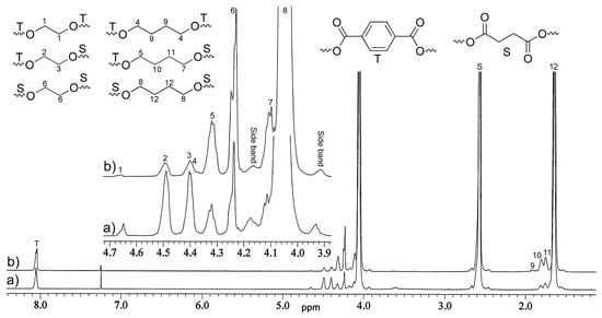1H NMR spectrum of SA/(BD + 5.0 mol% BHET) copolyesters prepared using (a) H3PO4 and (b) (nBuO)4Ti catalyst. Signal assignments are denoted using the numbers 1–12 and the letters T and S in both the structures and spectra.