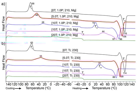 The Tc signals, observed during the cooling process after the first heating scan, were significant at 68 and 48 °C, accompanied by ΔH values of 67 and 55 J/g, for PBS[0T; 1.0P; 210; Mg] and PBS[5.0T; 1.0P; 210; Mg], respectively, while the Tcc signals, observed during the second heating process, were feeble. These observations suggest that the crystallization process occurred rapidly for PBS and the copolyester prepared with a small amount of BHET (5 mol%). Interestingly, PBS[10T; 1.0P; 210; Mg] exhibited both Tc and Tcc signals at 28 and 19 °C, respectively, with substantial intensities. This indicates the occurrence of the crystallization process at room temperature at a relatively slow pace. In contrast, for PBS[15T; 1.0P; 210; Mg], the Tc signal was not apparent, and it only exhibited a significant Tcc signal over a broad temperature range of 20–70 °C, indicating a slow crystallization rate. As for PBS[20T; 1.0P; 210; Mg], neither Tc nor Tcc signals were observed.