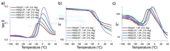 Temperature dependence of (a) tanδ, (b) storage modulus (E′), (c) loss modulus (E″) curves from DMA runs illustrated for PBS[xT; 1.0P; 210; Mg] (x = 0, 5.0, 10, 15, 20) series.