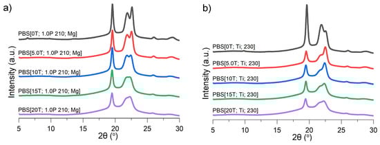 The observed thermal properties align well with the wide-angle X-ray diffraction (WAXD) patterns (Figure 5). In both PBS[0T; 1.0P; 210; Mg] and PBS[0T; Ti; 230], we observed fairly sharp and distinct signals at 2θ angles of 19.5, 21.8, and 22.6°. However, these signals became increasingly blurred as BHET units were incorporated into the structure, and the blurring intensified with a higher concentration of BHET units. This blurring effect was marginal in the PBS[xT; 1.0P; 210; Mg] series (x = 5.0, 10, 15, 20) (Figure 5a). In contrast, the PBS[xT; Ti; 230] series exhibited a significant degree of blurring (Figure 5b). This observation was consistent with the 1H NMR spectra, specifically, a more random distribution of –O2CC6H4CO2– and –OCH2CH2O– units, and the significant reduction in Tm values observed in the DSC curves for the PBS[xT; Ti; 230] series.