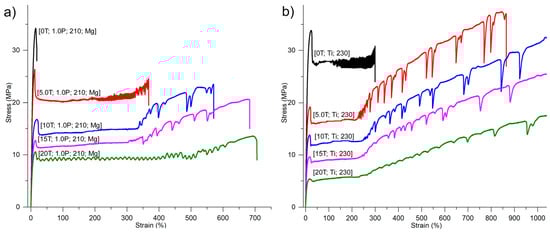 Tensile curves for PBS and its copolyesters prepared using (a) H3PO4/Mg(2-ethylhexanoate)2 and (b) (nBuO)4Ti catalyst.