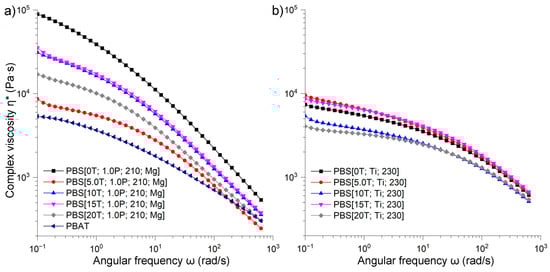 Flow curves measured using rotational rheometer at 170 °C for PBS and its copolyesters prepared using (a) H3PO4/Mg(2-ethylhexanonate)2 and (b) (nBuO)4Ti catalyst.