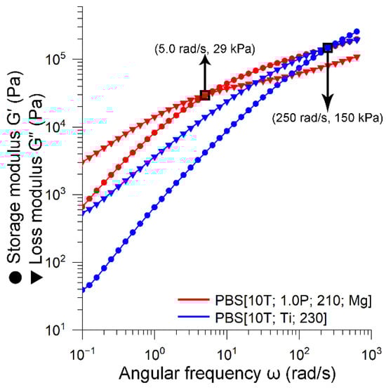 Comparison of dynamic moduli vs. angular frequency between PBS[10T; 1.0P; 210, Mg] and PBS[10T; Ti; 230].