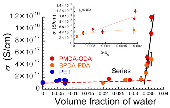 - Kim, T.Y.; Kim, W.J.; Lee, T.H.; Kim, J.E.; Yoon, H.G.; Suh, K.S. Electrical conduction of polyimide films prepared from polyamic acid (PAA) and pre-imidized polyimide (PI) solution. Express Polym. Lett. 2007, 1, 427–432. [Google Scholar] [CrossRef]