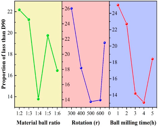 3.2.4. Visual Analysis of Orthogonal Test Efficiency Curve for Mechanical Activation and Refinement by Ball Milling