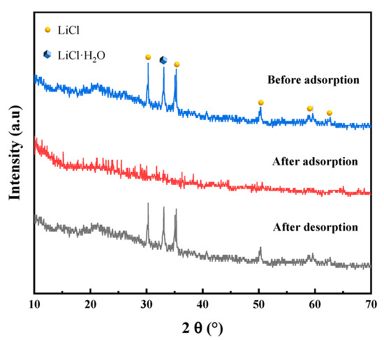 2O. This finding indicates the presence of LiCl in its crystalline form within the unabsorbed PAM-LiCl. Upon water absorption by the PAM-LiCl hydrogel, the crystalline phase peaks vanished, suggesting complete dissolution of LiCl crystals and the existence of Li and Cl ions within the PAM backbone. This transition exemplifies the deliquescence of LiCl during water absorption, highlighting its ability to capture atmospheric water vapor and convert it into liquid water. Following the desorption process and water removal, LiCl recrystallizes, leading to the reappearance of sharp peaks in the XRD patterns. This outcome denotes a dynamic change in the crystalline state of LiCl throughout the adsorption–desorption cycle of PAM-LiCl. Collectively, these findings underscore the critical role of LiCl in the adsorption behavior of PAM-LiCl hydrogels. The crystallization dissolution recrystallization cycle of LiCl significantly contributes to the volume expansion and water absorption characteristics of PAM-LiCl hydrogels. The interaction of liquid water with the hydrophilic polymer chains in the PAM, facilitated by hydrogen bonding, leads to efficient water storage.