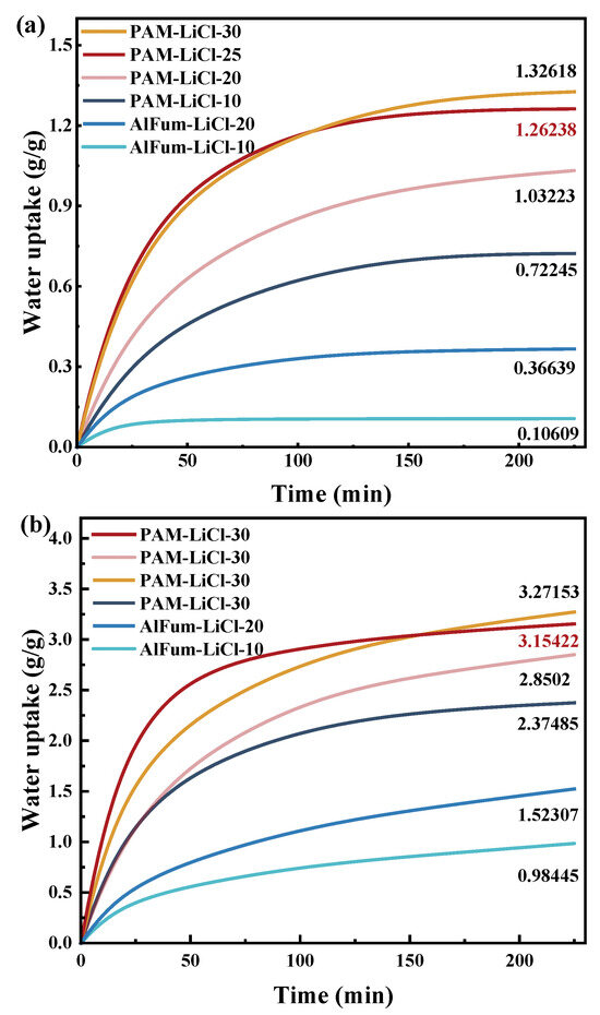 Figure 7b. The LiCl content of PAM-LiCl-25 was 72 wt%, whereas that of PAM-LiCl-30 was 82 wt%. The reason is that the polymer hydrogel stores the captured liquid water in its swollen cross-linked polymerization network when absorbing moisture. Thus, the hydrogel acts as a reservoir during the moisture absorption process. When the salt content is relatively high, the hydrogel percentage becomes less, and the reservoir naturally holds less water. When moisture absorption reaches the solid water storage limit of the PAM-LiCl hydrogel, it will liquefy, similar to the porous–salt composite adsorbent saturated with moisture. However, the amount of water uptake required for salt leakage to occur will be much more significant for the hydrogels. From another aspect, for operation at higher moisture contents, the salt content only needs to be further optimized to ensure the moisture absorption capacity of the PAM-LiCl hydrogel whilst also taking care of the water storage capacity of the PAM, thereby limiting the leakage of hydrated salt and helping to avoid potential corrosion in practical applications.