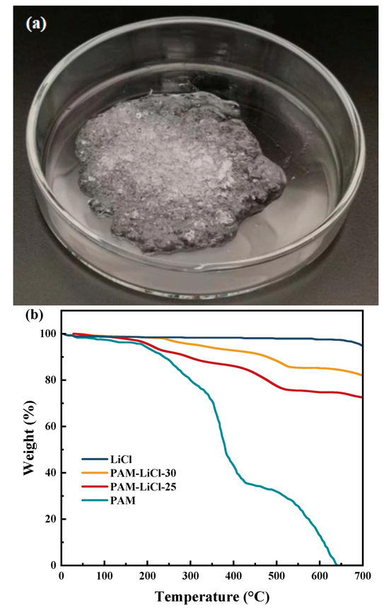 Figure 7a). After treatment by LiCl solution with various concentrations, the actual mass of the LiCl substance loaded on PAM was further investigated. To investigate the above reasons, the LiCl content in the PAM-LiCl-25 and PAM-LiCl-30 was obtained through TG analysis, as shown in
