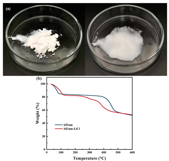 Figure 9b shows the TG analysis of AlFum and AlFum-LiCl. Concurrently, given that AlFum-LiCl is a porous MOF-salt-based adsorbent, it facilitates both physical and chemical adsorption during the moisture adsorption process. Consequently, we assessed the pore sizes of AlFum and AlFum-LiCl using a physical adsorption analyzer, and have presented the findings in