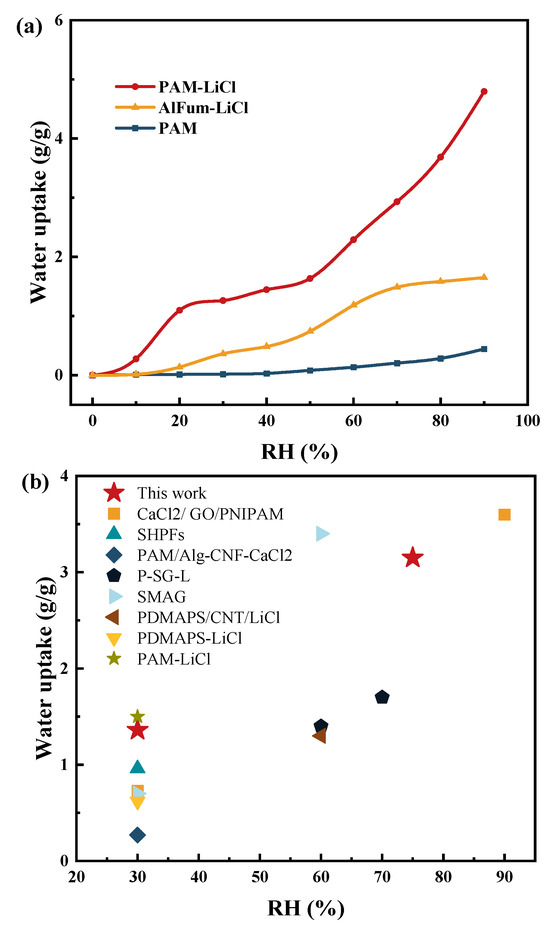 Figure 11b), particularly at higher relative humidity. At 25 °C, 75% RH, the equilibrium water uptake of AlFum-LiCl was 1.52 g/g, and the average adsorption rate was 5.35 mg/g min.