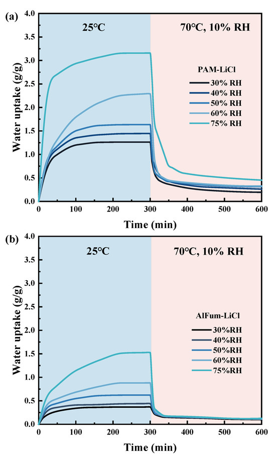 Figure 11a illustrates the curves of PAM-LiCl adsorption at 25 °C with different relative humidities and subsequent desorption at 70 °C with 10% RH (water vapor partial pressure approximately equal to the saturation vapor pressure at 25 °C). At various relative humidities, 80% more saturated adsorption capacity could be achieved after 100 min adsorption. With an increase in relative humidity, the amount of water collected after adsorption equilibrium increases from 1.26 g/g at 30% RH to 3.15 g/g at 75% RH. Moreover, the corresponding average adsorption rate also increased from 4.43 to 11.05 mg/g·min. From another aspect, the desorption kinetics are satisfactory, and PAM-LiCl can desorb 80% or more of the adsorbed water within 60 min. Comparatively, the adsorption amount and the adsorption kinetics of AlFum-LiCl are slower (