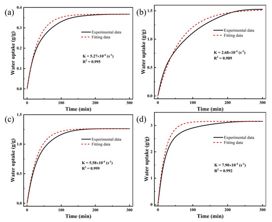 We also fit the experimental data of PAM-LiCl and AlFum-LiCl with the linear driving force (LDF) model to investigate their adsorption rate coefficients to understand further the dynamic adsorption characteristics of these two adsorbents. The adsorption rate coefficients K of PAM-LiCl at 25 °C 30% RH and 75% RH are, respectively, 5.58 × 10