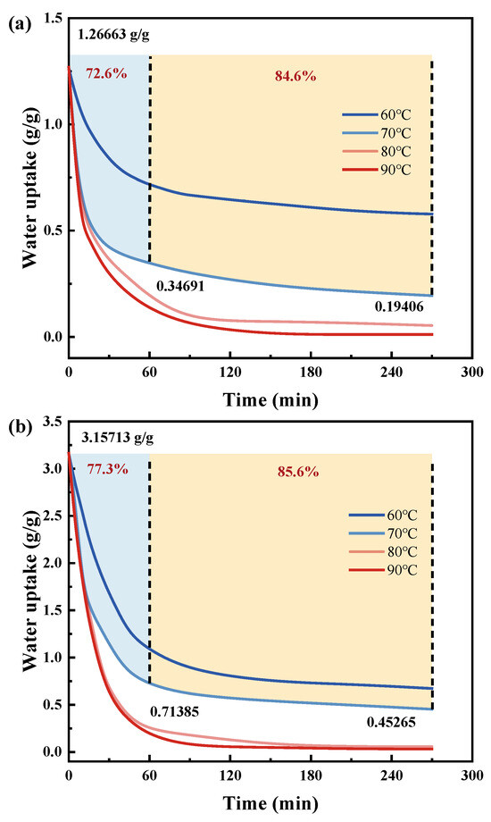 Figure 13 shows the desorption data of PAM-LiCl at different temperatures after reaching an adsorption equilibrium at 30% and 75% RH, respectively. Undoubtedly, the higher the temperature, the faster the desorption rate. After reaching the equilibrium adsorption of 1.26 g/g at 25 °C and 30% RH, PAM-LiCl can desorb 72.6% of the adsorbed water in 60 min and 84.6% of the captured water in 270 min at a reasonable desorption temperature of 70 °C. Of course, if the desorption temperature is appropriately increased to 80 °C or 90 °C, the desorption perfection will be higher. Notably, the desorption rate of PAM-LiCl does not slow down and even increases somewhat at 25 °C, 75% RH with an equilibrium adsorption capacity as high as 3.15 g/g. At a desorption temperature of 70 °C, the desorption perfection of PAM-LiCl reached 77.3% after 60 min and 85.6% after 270 min, both of which were higher than that of the low water content case. The reason is that PAM-LiCl hydrogels possess the property of water absorption volume expansion. Moreover, the volume and specific surface area of PAM-LiCl increase with water absorption before reaching the water storage limit for liquefaction and salt leakage, leading to faster desorption kinetics. From another aspect, although the interaction between PAM-LiCl and trapped water makes more water molecules in the form of weak or free water [