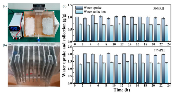 Figure 15b), and rolls down to the reservoir. A total of 20 g of activated PAM-LiCl was used in the experiment and placed on two 180 × 120 mm heating sheets. Owing to the viscosity of the gel material after a small amount of water uptake, PAM-LiCl fit well and tightly with the heating sheets. Then, in a constant temperature and humidity chamber, the air–water extraction experiments at 25 °C, 30% RH and 25 °C, 75% RH, were carried out. During the investigation, adsorption was carried out for 1 h, followed by desorption at a temperature of 70 °C for 1 h.