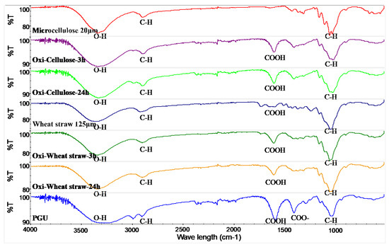 FTIR spectra of oxidized microcellulose, from top to bottom, microcellulose, oxidized for 3 h, oxidized for 24 h, wheat straw, oxi-wheat straw for 3 h, oxi-wheat straw for 24 h, polyglucuronic acid (PGU: bacterial polyglucuronic acid from S. meliloti M5N1CS).