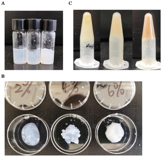 Cross-linking analysis after sonication: (A) 2%, 4%, 6% oxidized microcellulose 450 μL with 1 M calcium chloride 50 µL; (B) 2%, 4%, 6% oxidized microcellulose detail show; (C) 2%, 4%, 6% oxidized wheat straw 450 µL with 1 M calcium chloride 50 µL.