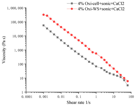 The viscosity analysis after cross-linking. The black line represents 4% oxidized wheat straw, and the red line represents 4% oxidized microcellulose.