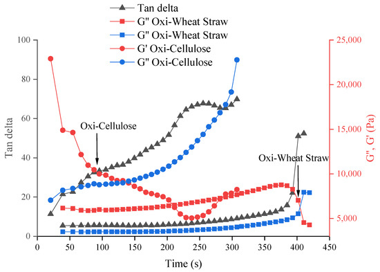 The crosslinking time of different materials with calcium chloride. It is 4% oxidized microcellulose crosslink with 1 M CaCl2 (around 2 min) and 4% oxidized wheat straw crosslink with 1 M CaCl2 (7 min). The arrows in the graph are the cross-linking points (gelation points).