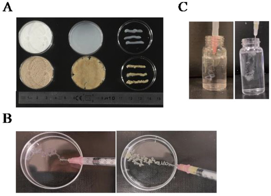 Printability and injectability tests after sonication were conducted as follows: (A) 4% oxidized microcellulose (top) and wheat straw (bottom) underwent a printability test under a 19 G (1 mm) diameter needle; (B) Printability tests of 4% oxidized microcellulose (left) and wheat straw (right) were performed in a 1 M calcium chloride solution using a needle diameter of 0.4 mm; (C) Injectability tests of 4% oxidized microcellulose (left) and wheat straw (right) were carried out in a 1 M calcium chloride solution using a needle diameter of 34 G (0.1 mm).