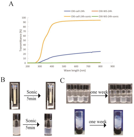 (A) Changes in transmittance of 4% oxidized microcellulose and wheat straw before and after sonication. (B) Demonstration of oxidized microcellulose and wheat straw transmittance and, (C) one-week stability observation of oxidized cellulose solutions after sonication (up) and of oxidized cellulose solutions after sonication and CaCl2 crosslink (down).