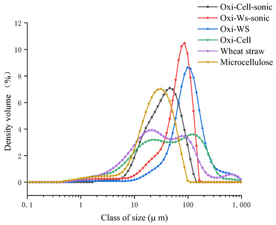 The particle size analysis was performed by the Mastersizer 3000 (particle size range from 0.01 to 3500 μm, France, Malvern Company). As mentioned in 2.2, before the experiment begins, all samples are ground and passed through a 125 µm sieve, and for sonicated samples, dissolved in water and then sonicated for five minutes (same as above), then thoroughly dried and then ground then passed through 125 mesh sieve. To conduct the experiment, begin by pouring 100% ethanol into a preheated 500 mL beaker. Once the instrument is adequately preheated, add oxidized cellulose and wheat straw particles until the detected signal reaches within the measurable range and stabilizes gradually. Activate the laser to measure particle size. Post-measurement, rinse the system thoroughly with 100% ethanol, repeating this process five times until no particle prompts are detected. This entire procedure should be repeated three times for robust and reliable results.