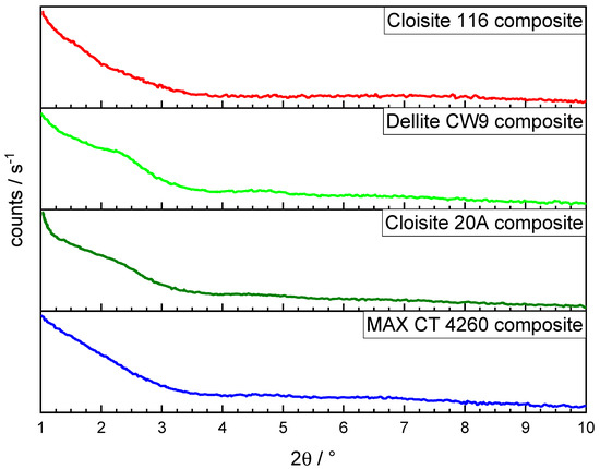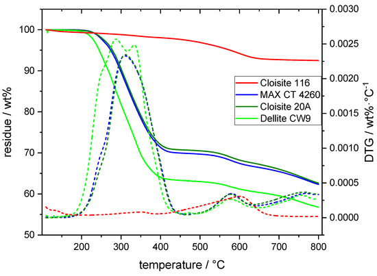 The thermal decomposition behavior of the modified bentonites as determined by TGA showed additional mass loss steps compared with the unmodified ones (Figure 1). The lowest onset for DMDHT degradation extracted from the DTG curves was observed in Dellite CW9 at 203 °C, whereas the onset for MAX CT 4260 and Cloisite 20A lay at 210 °C. Dellite CW9 also exhibited a high amount of degradation early on, whereas this point was reached at higher temperatures for the other OLS. The two maxima in the DTG curves for Dellite CW9 indicate the partial enrichment of DMDHT on the surface of Dellite CW9 particles, not partaking in the interlayer penetration of the silicate via cation exchange. Similarly, Bertin et al. observed differing degradation onsets for Irganox 1010 on talc, depending on whether the stabilizer was free, bound to the surface, or fully adsorbed [24]. Hence, the DMDHT on the surface was decomposed first with a maximum at 288 °C, and the organic modifier embedded into the interlayers decomposed with a maximum at 333 °C. No such clear separation was observed for the remaining two OLSs, where only one degradation maximum was visible at 311 °C. Dellite CW9 showed by far the highest amount of organic modifier, followed by the other two OLSs with comparable loadings of the modifier. The next step in thermal degradation occurring between 450 and 650 °C was observed for all the OLSs as well as the unmodified Cloisite 116 and may, therefore, be linked to an inorganic decomposition mechanism. This step can, indeed, be attributed to the dehydroxylation of silicate-bound structural OH units in montmorillonite, the main constituent of bentonite [25]. The remaining step for mass loss at temperatures higher than 650 °C was observed for OLS only and most likely corresponded to some charring process in the organic residues.